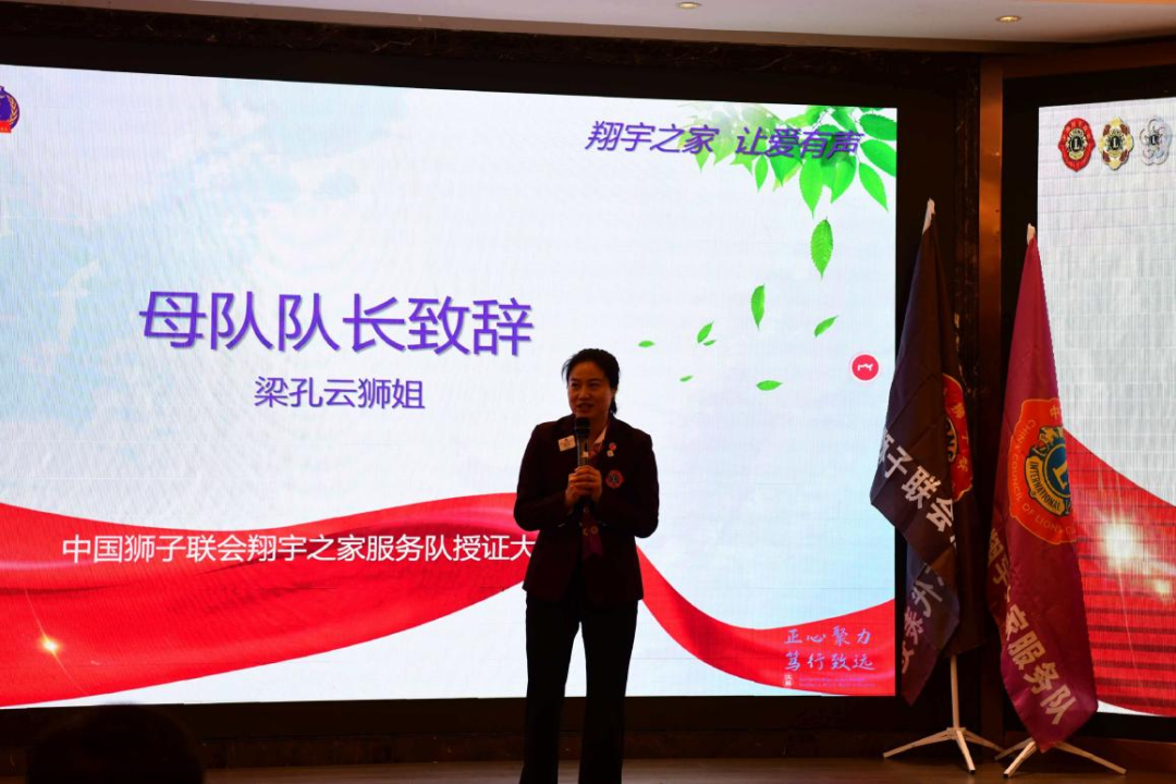 金狮缘服务队本年度队长梁孔云狮姐作为母队代表登台贺词,她为翔宇之家服务队的成立送上真挚祝福,期待这支新生力量能点燃公益热情,传承“正己助人,服务社会”的狮爱精神,让公益之火燎原四方。
