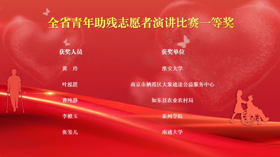 近日,在省残联、团省委联合举办的“茉莉芬芳·阳光助残”全省青年助残志愿服务骨干培训班暨讲演活动中,淮安大学黄玲以“绘就视障彩虹梦 青春助力苔花开”为主题,娓娓道来团队助力视障群体的动人故事。最终,黄玲凭借出色表现荣获全省青年助残志愿者演讲比赛一等奖。